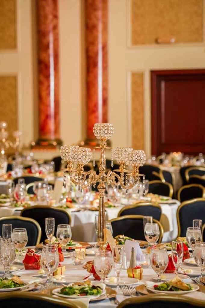 Each ballroom has its own private restrooms, bridal suite and cocktail room. Décor runs from the European design in the 600-seat capacity Palazzo Ballroom to the glass-domed Skylight Ballroom with tis 1,000-square-foot marble dance floor that seats up to 330 guests. If you prefer, choose the French influence found in the Palace Ballroom or the cosmopolitan Empire Ballroom with a huge saltwater fish tank and stunning intricate mosaic wall of art. Each seats up to 330.